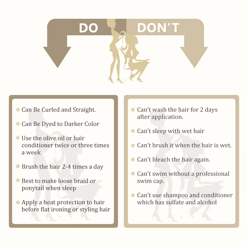 Q: What is The Special Treatment for Full Shine Tape Extensions?A: Do not wash hair for 3 days after you first install it. Use mid shampoo to lukewarm water and twist hair. And never use a hairdryer or tongs too hot. Please also remember to apply the hair on the clean and unconditioned hair. For better performance, please heat the tape before you apply it.