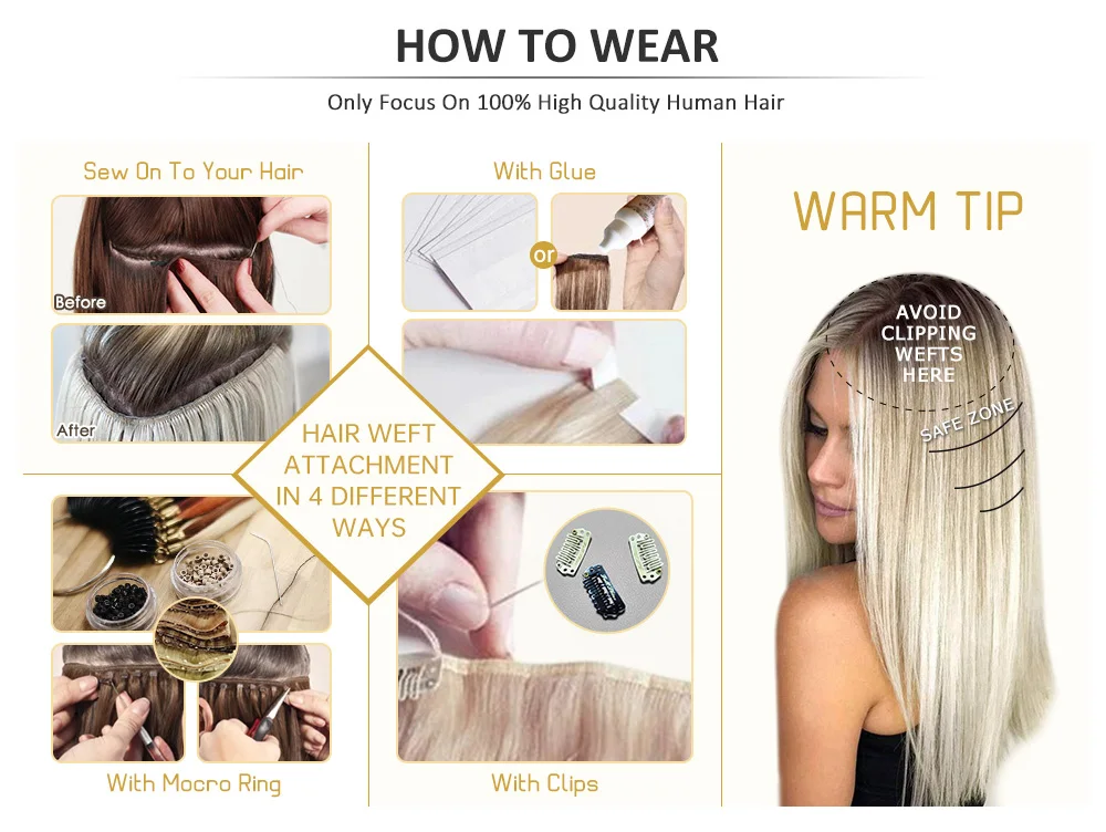 •Clip the hair weft into your own hair like the normal clip in extensions.