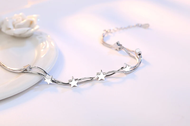LMNZB 100% 925 Solid Silver Bracelet Square Box Star Double Chain Adjustable Bracelet Anklet For Women Pulseira LSLK22