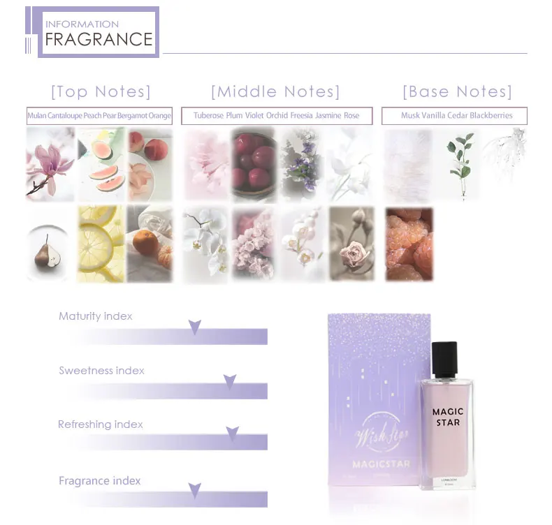 Top notes: Magnolia, Melon, Peach, Pear, Bergamot, Orange