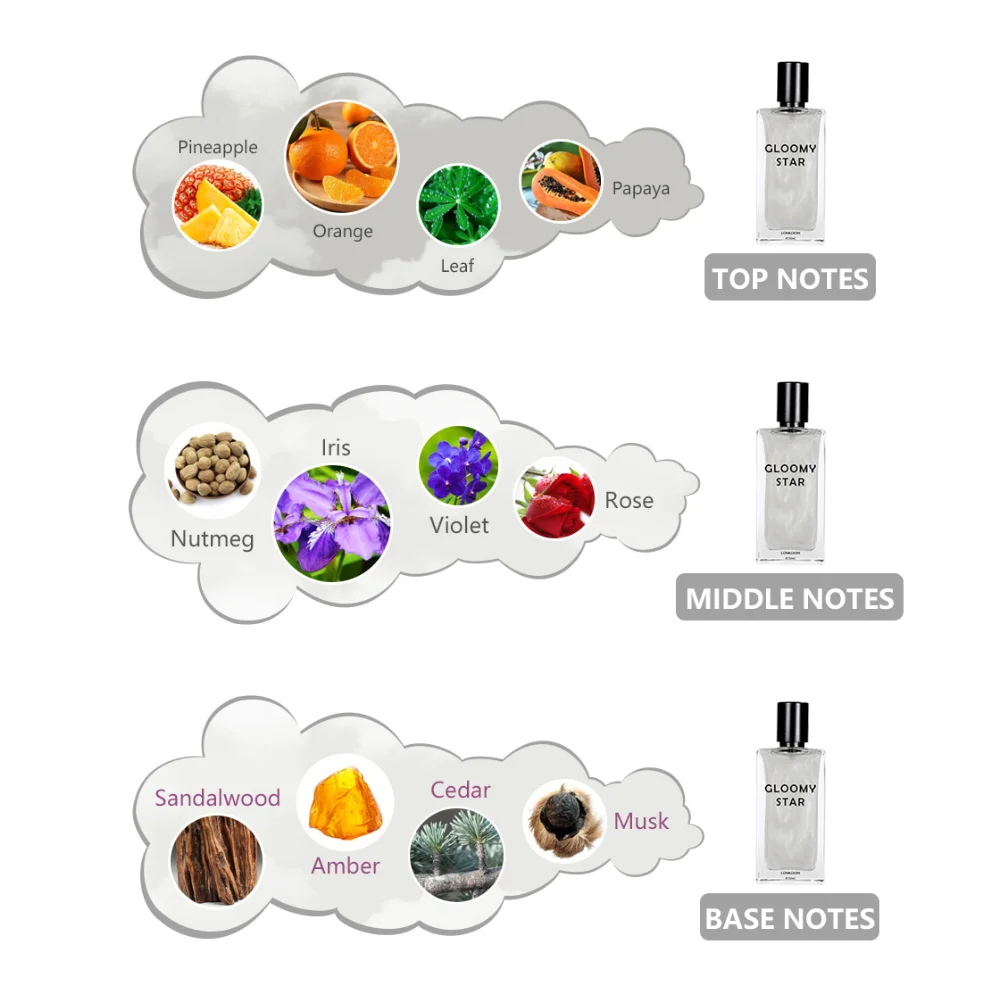Base notes: Kashmiri wood, ambergris, sandalwood, musk, violet