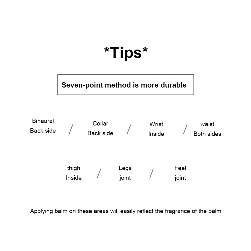 *The seven point method is more lasting: behind the ears, the back of the neck, the inside of the wrist, the sides of the waist, the inside of the thigh, the leg joints, and the ankle joints. Applying the ointment on these parts will easily reflect the fragrance of the ointment.